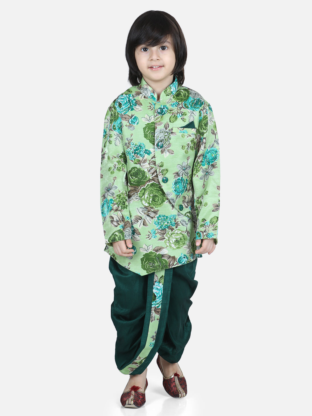 This stylish BownBee Boys Printed Sherwani Dhoti Set is made with quality fabric, designed for comfort and durability. The intricate pattern and colors make it a great choice for special occasions or festivals. This set is sure to bring timeless elegance to your little boy's wardrobe.