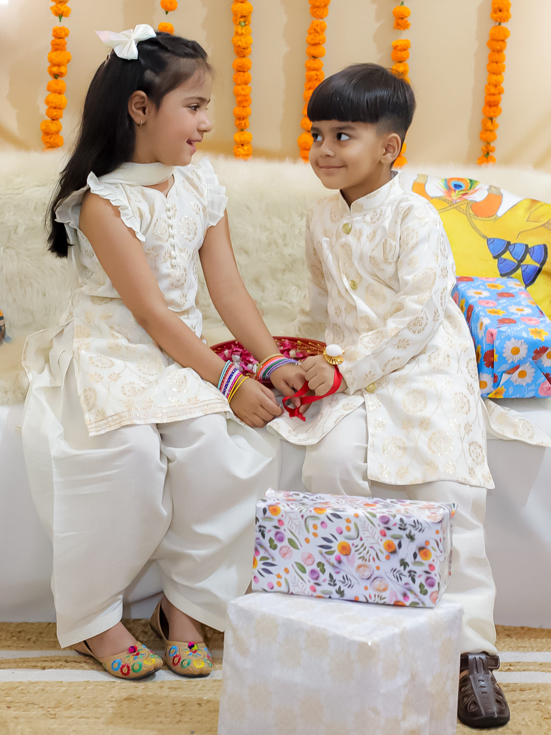 BownBee Sibling Set Pure Chanderi Front Open Sherwani Pajama with Kurti Salwar Dupatta Set- White